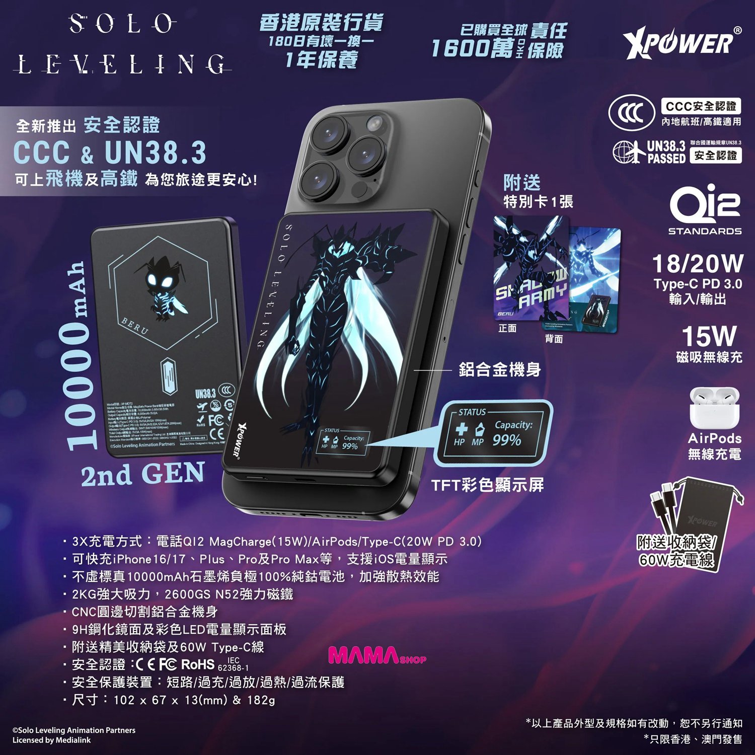 12月到貨 •3X充電方式: 電話QI2 MagCharge(15W)/AirPods/Type-C(20W PD 3.0) •可快充iPhone15/16、Plus、Pro及Pro Max等,支援iOS電量顯示 •不虛標真10000mAh石墨烯負極100%純鈷電池,加強散熱效能 •2KG強大吸力,2600GS N52強力磁鐵 •CNC圓邊切割鋁合金機身 •9H鋼化鏡面及彩色LED電量顯示面板 •附送精美收納袋及60W Type-C線 •安全認證: CCC/UN38.3/CE/FC/ROHS/IEC 62368-1 •安全保護裝置: 短路/過充/過放/過熱/過流保護 •尺寸: 102 x 67 x 13(mm) & 182g 網站自助下單: 1. 進入商舖,挑選貨品然後按購買,加到購物車後按下一步。 2. 選擇送貨方法後再填寫送貨/取貨資料 3. 選擇付款方法後再付款,然後就會收到訂單確認通知 4. 顧客會收到電郵通知,請於2日內付款,愈時訂單作廢 5. 付款後,請在訂單內上載付款存據,以便確認 選擇付款方法: 過數後請Send入數紙/請提供cap圖,請在訂單內上載付款存據,以便確認 取貨安排: 1). 選擇門市取貨的客人:確認訂單後,貨品到達門市後會以WhatsApp訊息通知取貨 2). 選擇順便快遞的客人(順豐到付): 確認訂單後,如有現貨約2-3個工作天內寄出 3). 選擇平郵的客人: 確認訂單後,如有現貨約2-3個工作天內寄出 如有任何查詢,請點擊右下角,揀選聯絡方法,與店長即時聯絡,歡迎在線查詢